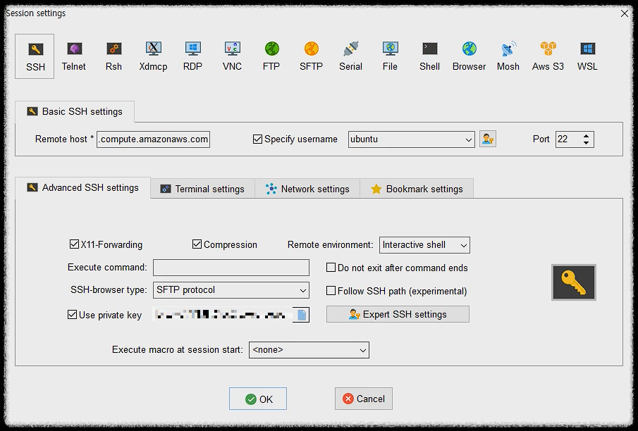 Use private key에 인스턴스 생성할때 설정한 key pair를 선택