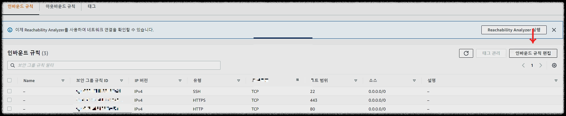 없다면 [보안 그룹]을 클릭하여 [인바운드 규칙 편집]을 할 수 있는 화면으로 이동합니다.
