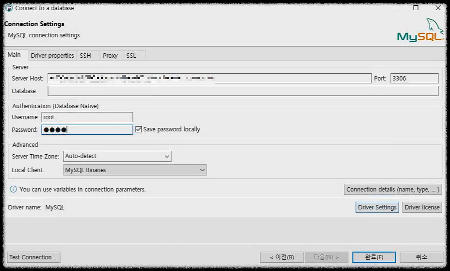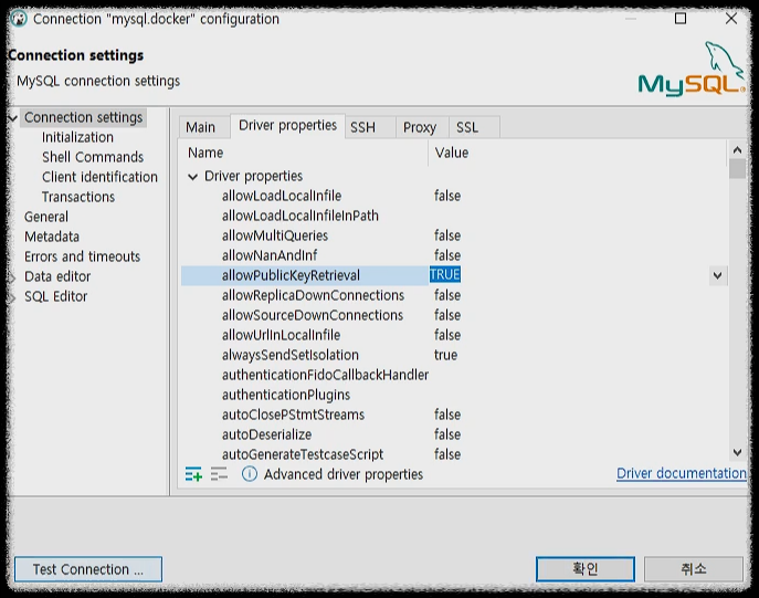 [Driver properties]에서 allowPublicKeyRetrieval을 TRUE로 변경합니다.